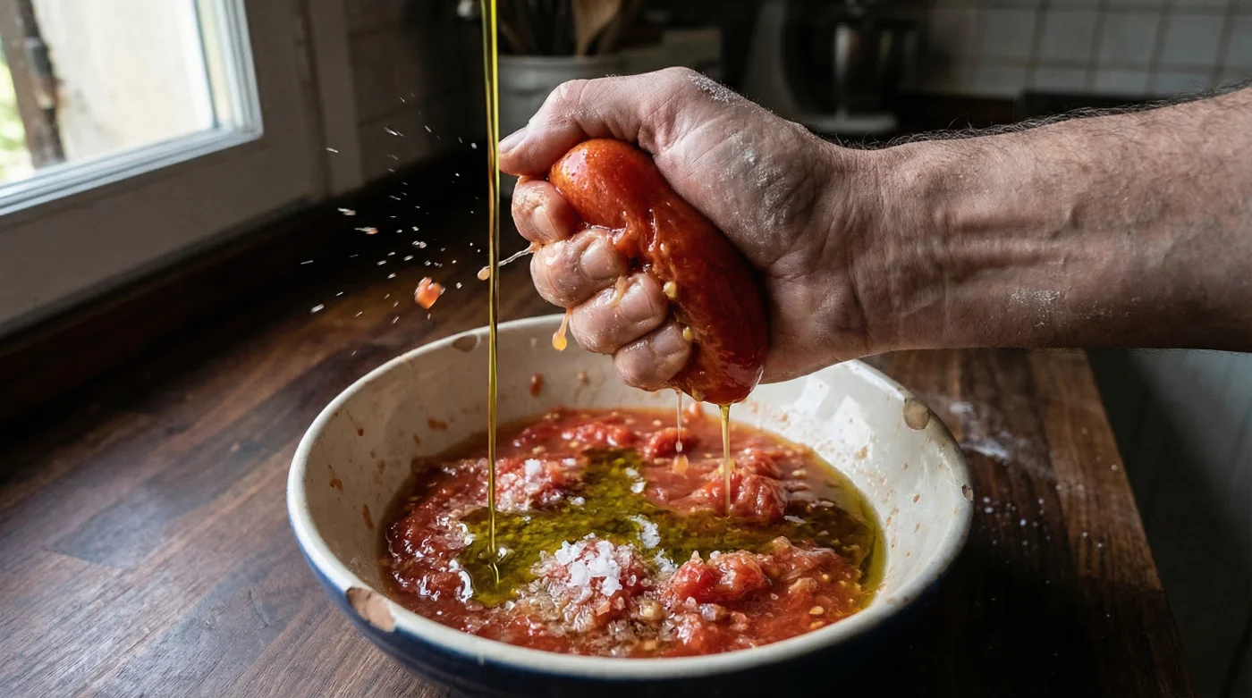 Aplicar el método auténtico comienza en el pasillo del supermercado. En Colombia, una verdadera lata importada de San Marzano DOP puede oscilar entre los 18.000 y 28.000 COP, una inversión que justifica tratar el producto con absoluto respeto. La técnica napolitana es draconiana en su simplicidad: abre la lata, retira los tomates enteros, descarta gran parte del líquido o puré de empaque (que suele ser denso y aguado) y colócalos en un bol profundo. Con las manos limpias, aplasta los tomates suavemente hasta desmenuzarlos. Añade la sal marina especificada y el aceite de oliva. Nada más. Ni orégano seco, ni ajo en polvo, ni cebolla. La magia reside en la pureza. Al aplastar a mano, rompes la pulpa a lo largo de sus líneas de falla naturales, preservando la pectina celular y evitando dañar las semillas amargas.