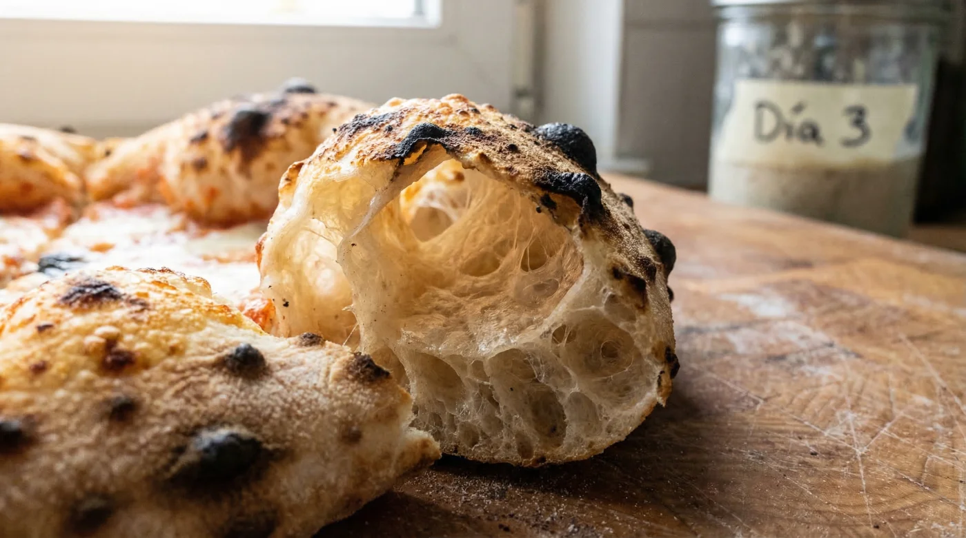 Durante las 72 horas de reposo, la enzima amilasa tiene tiempo suficiente para descomponer los complejos almidones de la harina en azúcares simples. Estos azúcares residuales son el combustible exacto que generará la famosa Reacción de Maillard en el horno, otorgando a los bordes ese color caramelo oscuro y un sabor profundo, casi dulce y lleno de umami. Simultáneamente, la proteasa trabaja relajando y acondicionando la red de gluten. Una red de gluten relajada significa que la masa tendrá una extensibilidad increíble, permitiendo estirarla hasta que quede translúcida en el centro sin desgarrarse, mientras que los bordes acumulan todo el potencial explosivo del gas retenido.