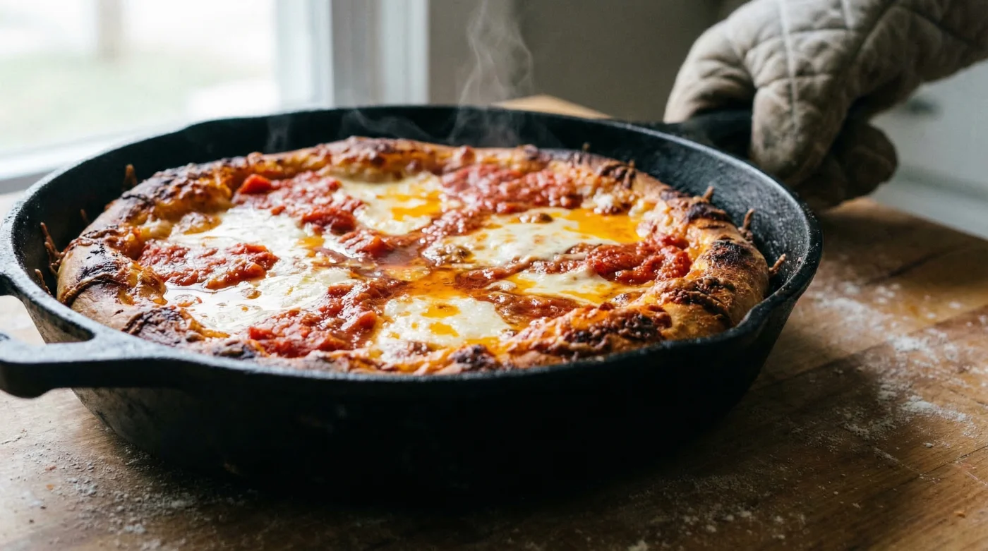 Una Sartén de hierro fundido precalentada absorbe la energía latente del horno y la inyecta de forma agresiva en la base de la masa al momento del impacto, activando la Reacción de Maillard de forma instantánea y caramelizando los azúcares de la harina. Comprender esta violenta transferencia de energía es el primer paso, pero identificar por qué tus pizzas anteriores fracasaron es vital para dominar la técnica por completo.